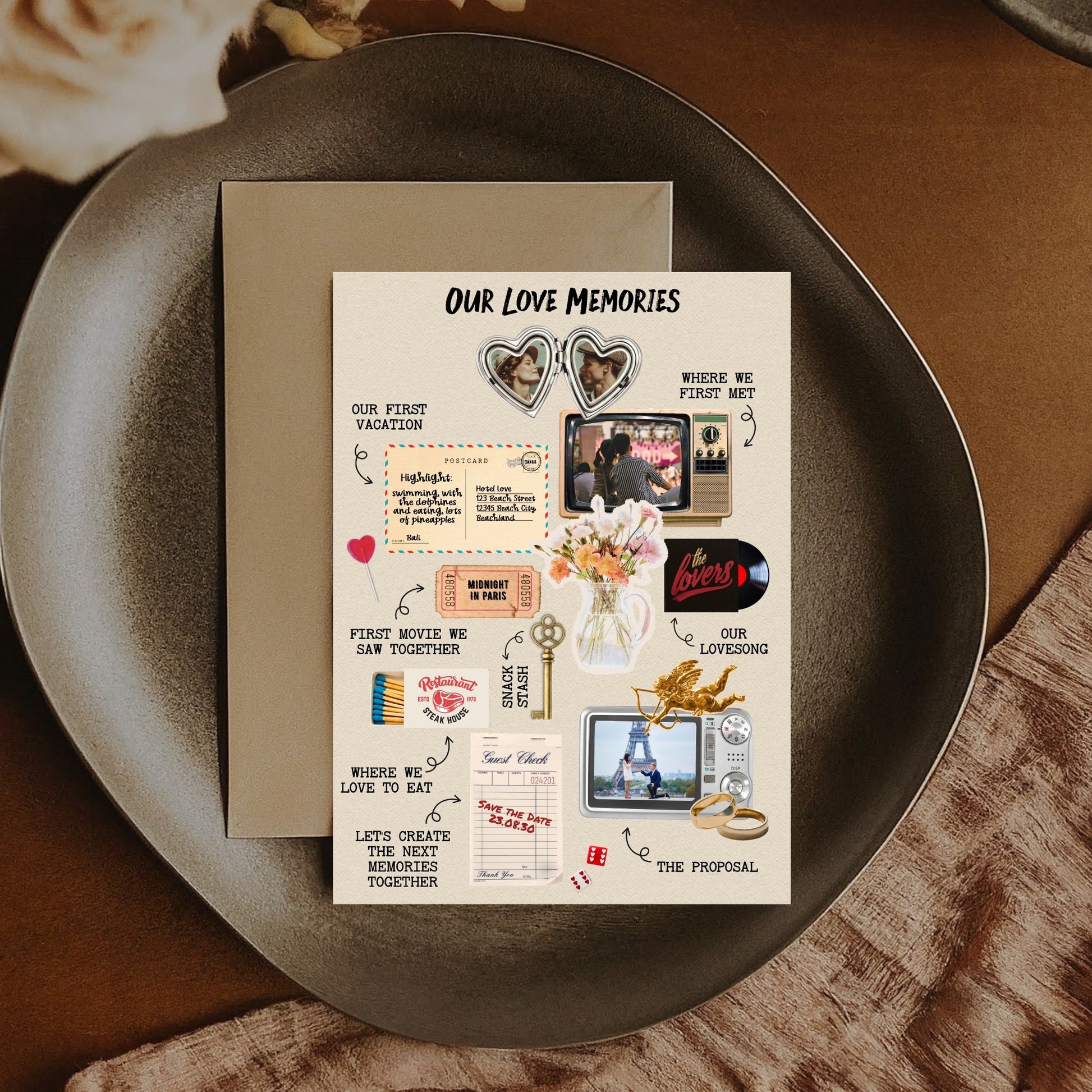 Designed in a modern collage style, this invitation feels like flipping through a scrapbook full of real, beautiful memories. Playful, romantic, and thoughtfully nostalgic, each element is a page in your shared story—and now you’re inviting your loved ones to help you write the next chapter: your wedding day.