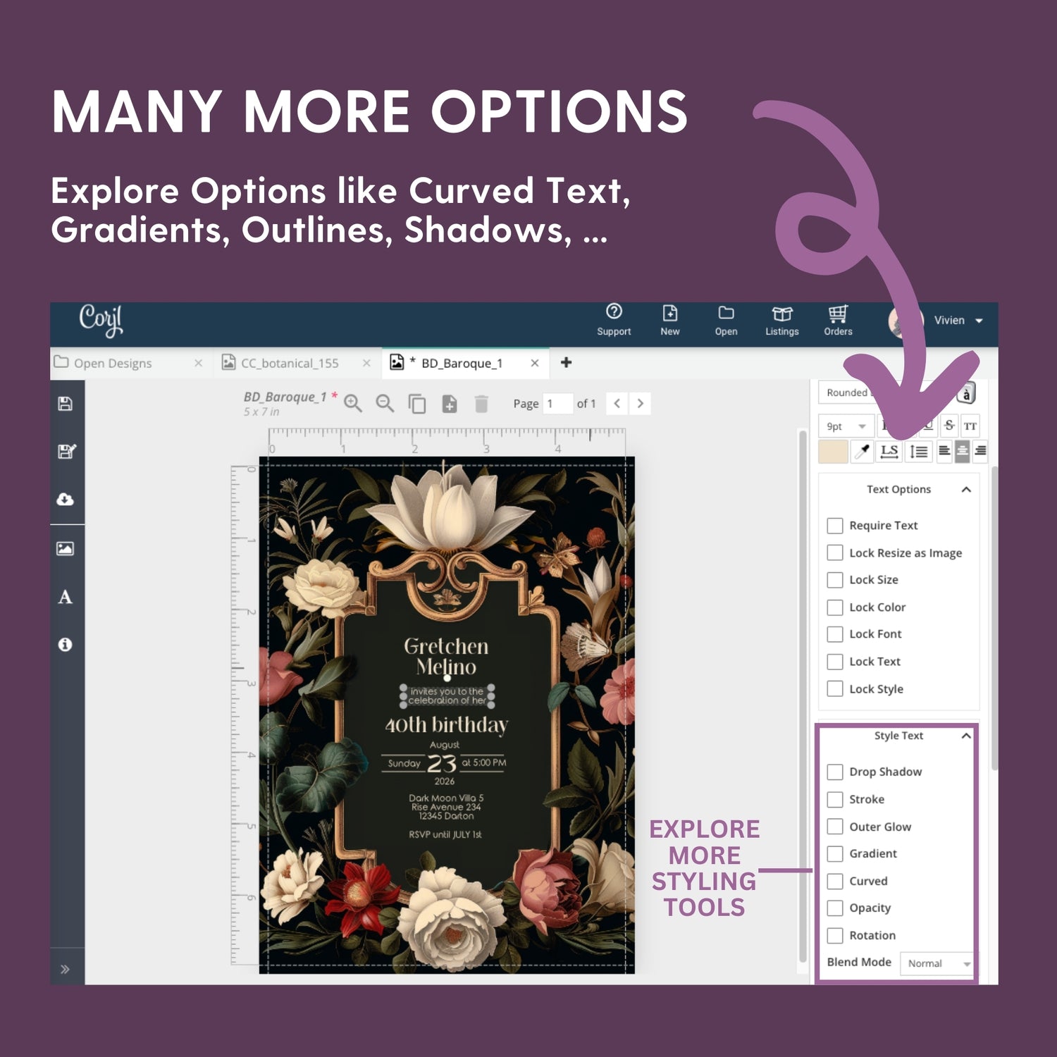 Unlock a range of styling possibilities with gradients, shadows, outlines, and curved text. These options allow you to add depth and creativity to your design, making it stand out with unique effects and personal flair. Let your imagination run wild!