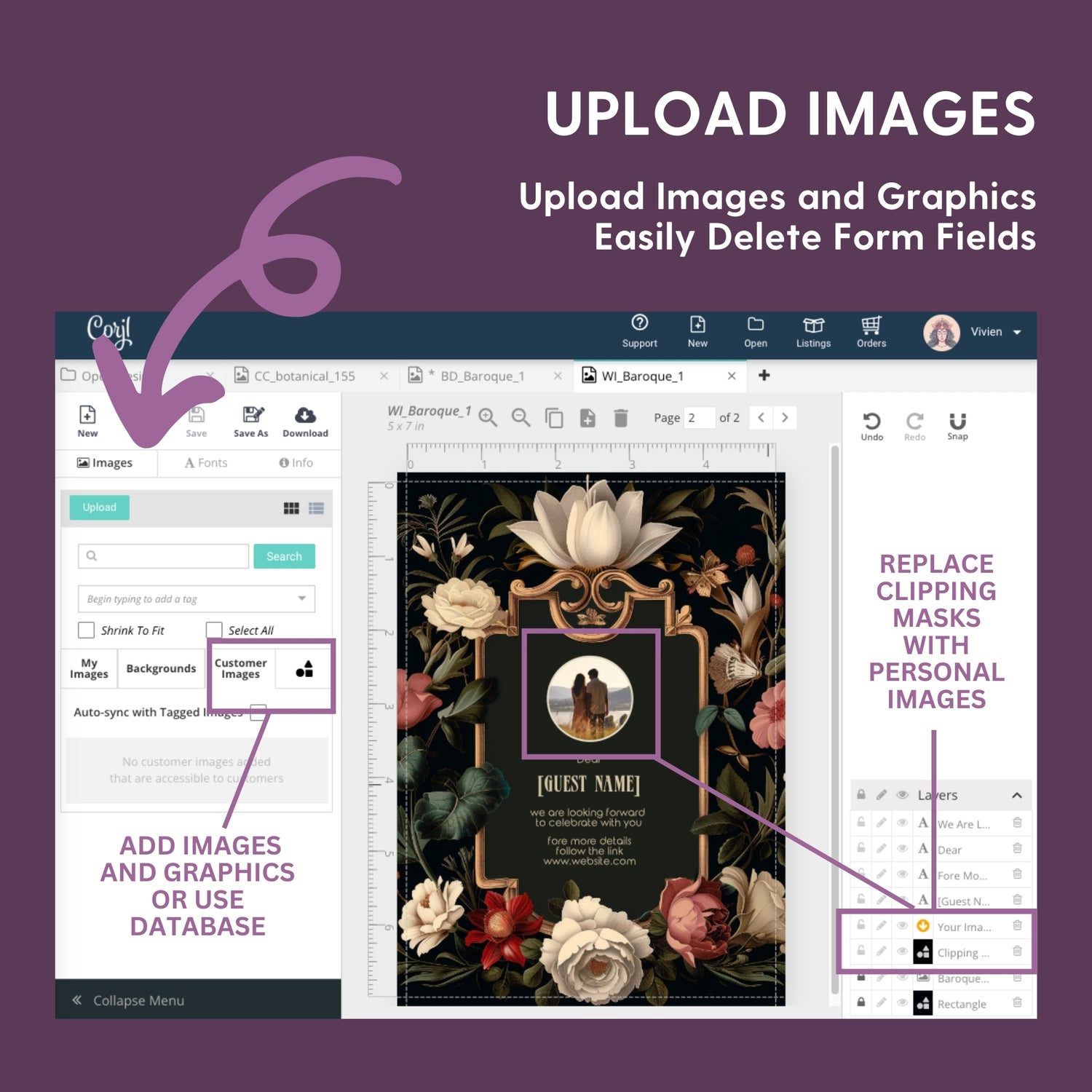 Enhance your design by adding personal images and graphics, such as couple photos and decorative lines. These elements allow you to further personalize your creation, making it truly unique and special. Let your creativity shine!