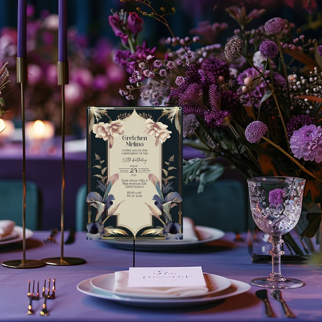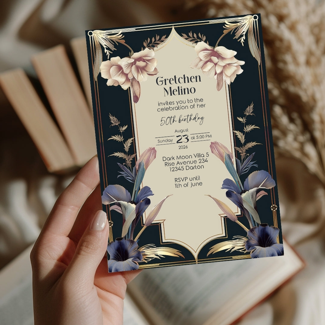Celebrate your special day with our Luxurious Vintage Royal Birthday Invitation. This exquisite design features a rich dark navy background adorned with intricate gold detailing and lush botanical elements. The delicate cream, lavender, and soft pink flowers add a touch of regal charm, making it perfect for any birthday celebration. Designed for those who appreciate vintage elegance with a royal flair, this invitation sets the tone for an unforgettable event.