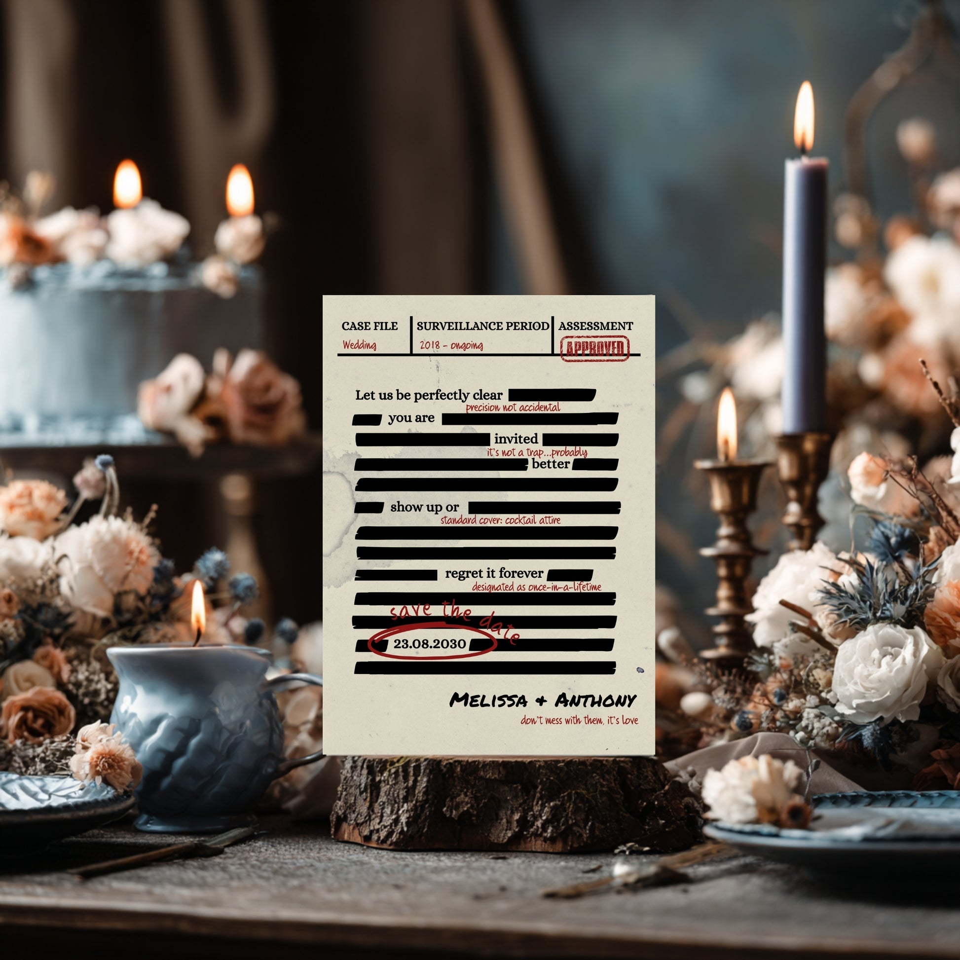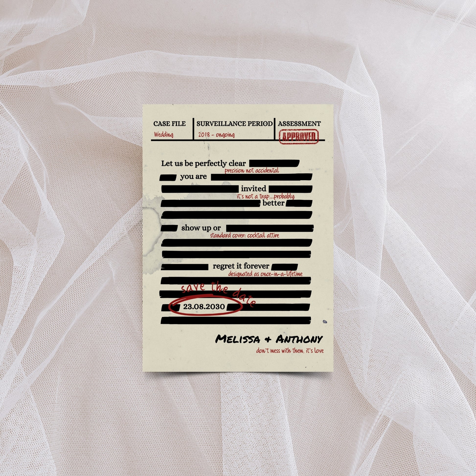 ✔️𝙑𝙚𝙧𝙨𝙖𝙩𝙞𝙡𝙚 𝙐𝙨𝙚: Ideal for themed weddings, quirky couples, or fans of spy movies, true crime, or government drama—this Save the Date guarantees smiles and second glances.
